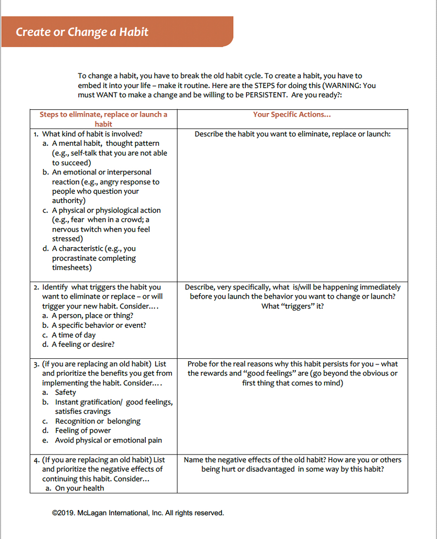 Habit change is often difficult. Discipline and persistence are critical, not only to plan a successful process, but to implement it. Create or Change a Habit (in Tools). This step-by-step guide wil help you be more successful in this most important of self-evolution activities.