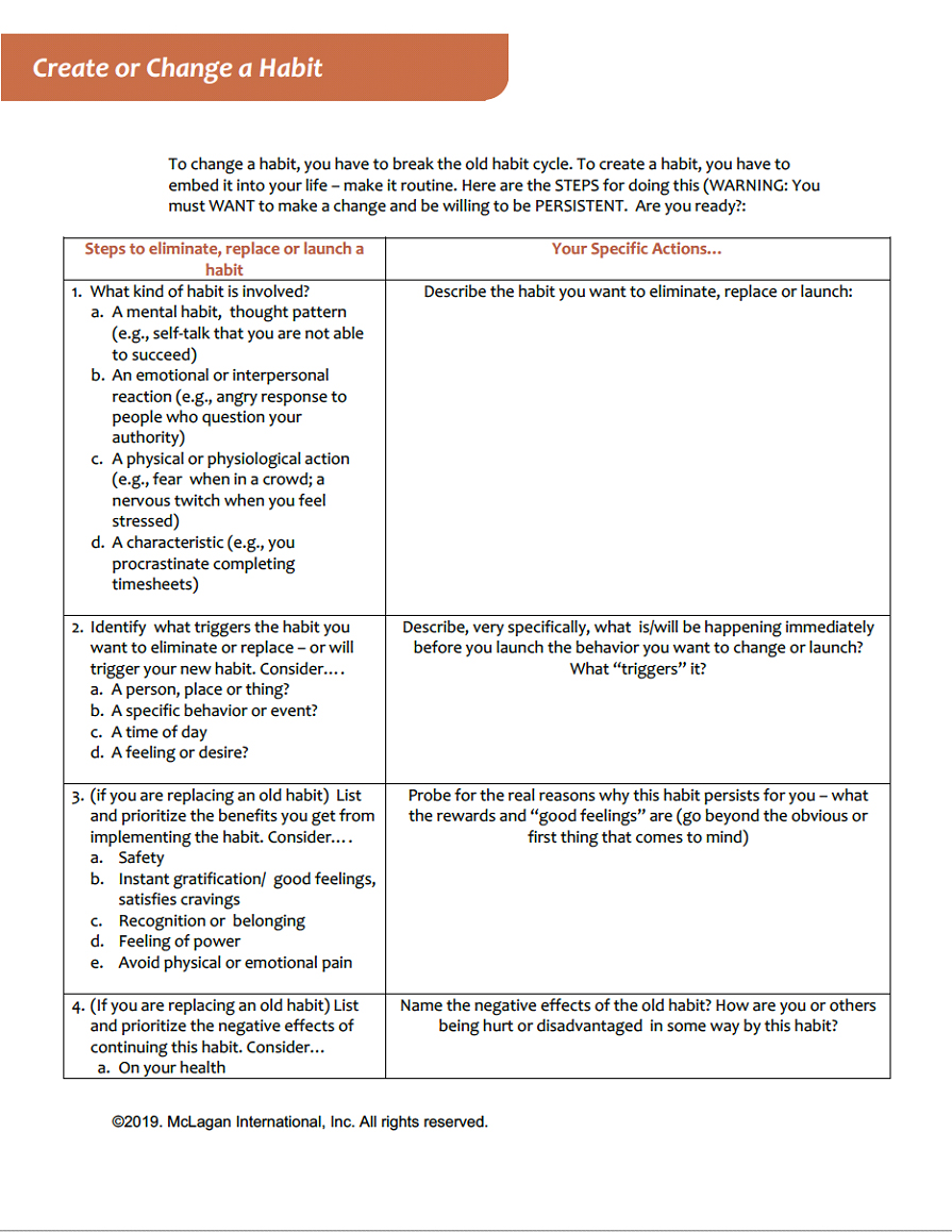 If you want to change a habit or adopt a new one, use the tip Change or Replace a Habit. It will guide you to success. There is also a Tool – Create or Change a Habit. Download and use the tool to plan how you will succeed.